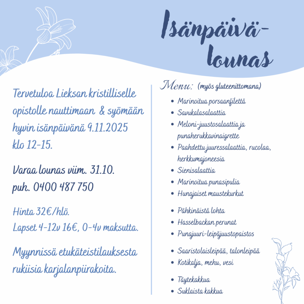 Tervetuloa Lieksan kristilliselle opistolle nauttimaan & syömään hyvin isänpäivänä 9.11.2025 klo 12-15.