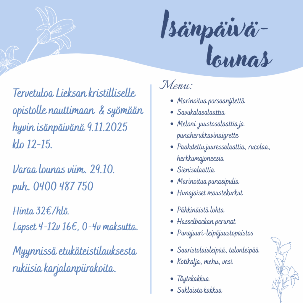 Tervetuloa Lieksan kristilliselle opistolle nauttimaan & syömään hyvin isänpäivänä 9.11.2025 klo 12-15.