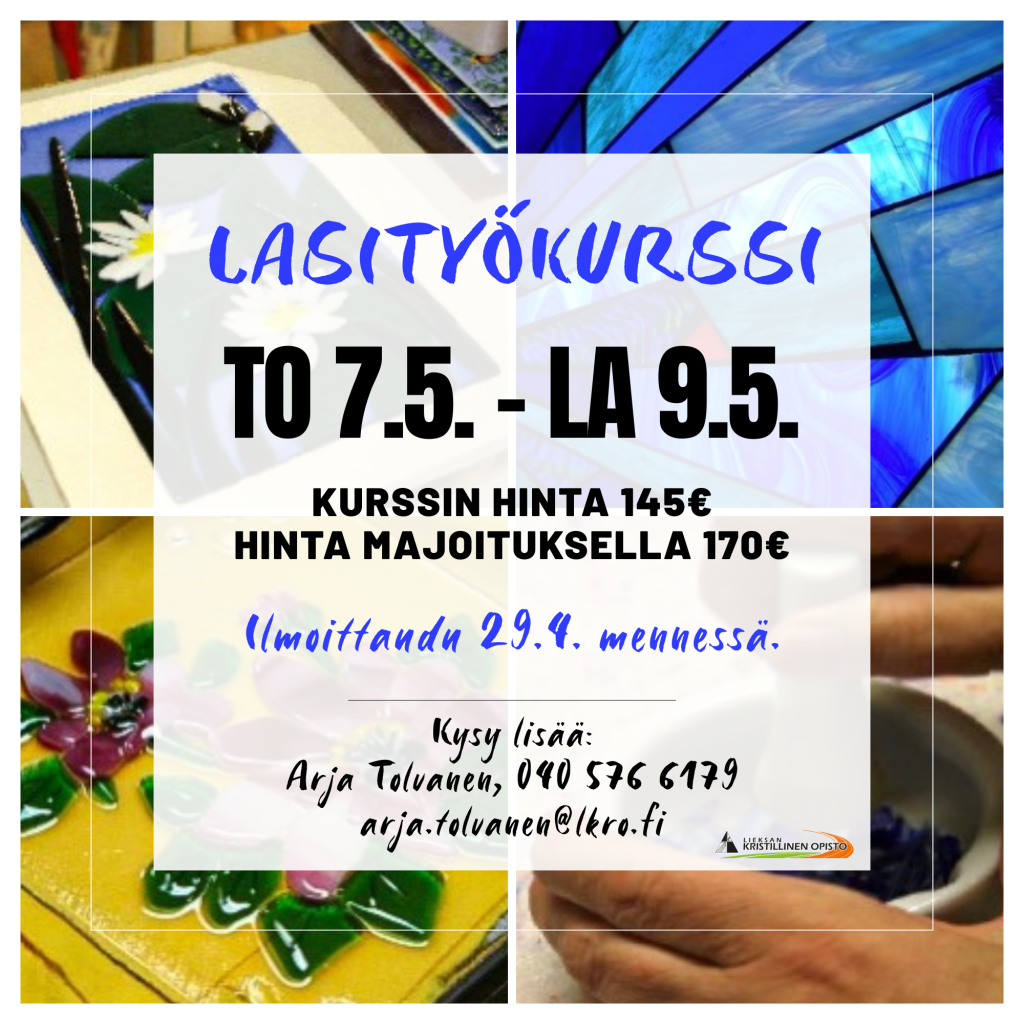 Kurssilla voit käyttää kierrätyslasia tai opistolta saatavia taidelaseja. Voit sulattaa muottiin, tasoiksi, koruiksi jne. Halutessasi voit tehdä myös tiffanytöitä kuparifoliotekniikalla. Kurssi sopii myös aloittelijalle.